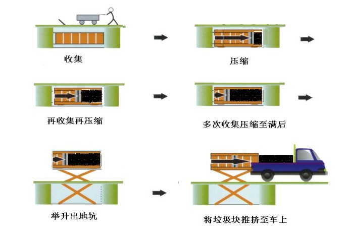 水平式生活垃圾壓縮中轉(zhuǎn)設(shè)備是將垃圾的卸(出)料、壓縮、儲存集合在一起,整體落于地下,利用地下空間將垃圾密閉在箱體內(nèi),地面上無垃圾外露現(xiàn)象,壓縮垃圾產(chǎn)生的污水經(jīng)排污管道直接流入污水井內(nèi),然后由污水泵排到城市污水管網(wǎng),徹底解決了垃圾在收集、儲存、裝運(yùn)過程中的污染環(huán)境、作業(yè)效率低等問題。整個設(shè)計僅有上蓋板露出地面,上蓋板可與周圍環(huán)境協(xié)調(diào)裝飾,達(dá)到融為一體的效果,使城市面貌更加美觀。