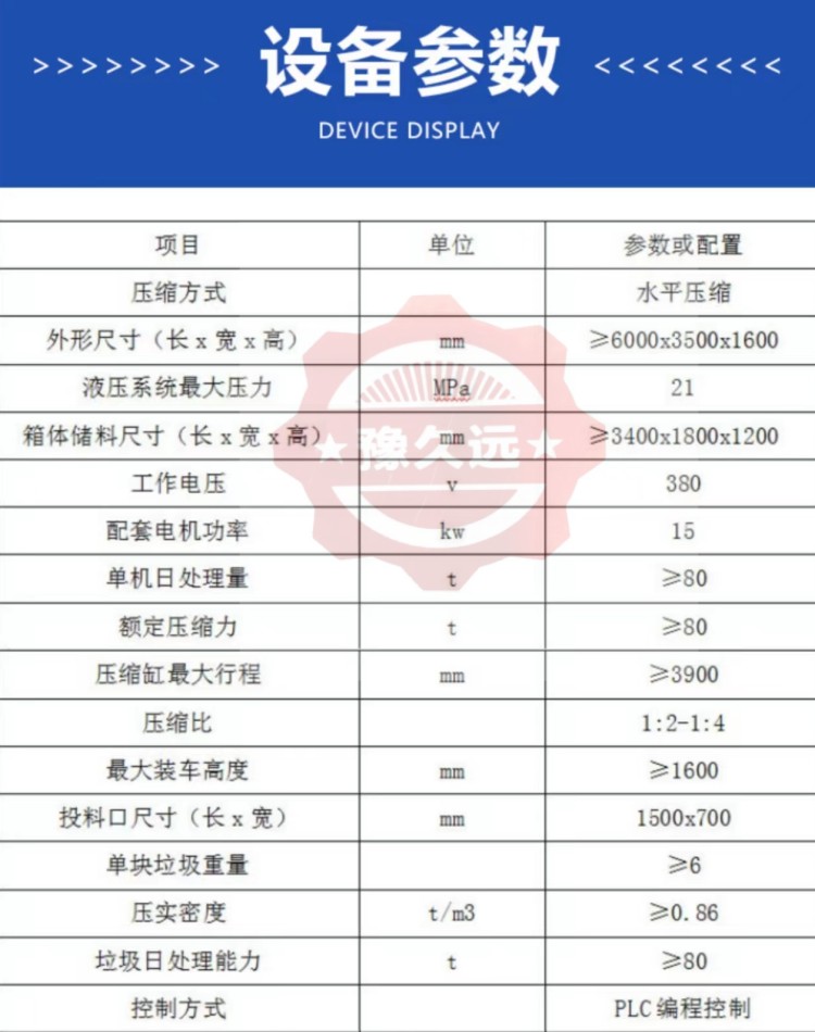 ◇平穩(wěn)可靠:兩側舉升,剪叉跨度大,升降平穩(wěn),無傾斜; ◇淺地坑:地坑深度僅為1.55m,保潔及維修極為方便; ◇高效率:壓實每噸垃圾時間≤10min; ◇全封閉水平壓縮:采用水平壓縮方式,垃圾壓縮密度≥0.86t/m3,垃圾壓縮后體積大大減小,從而大幅度提高轉運車輛裝載量和轉運效率,降低垃圾處理、轉運等費用; ◇動作少,故障率低,整套設備的垃圾壓縮、裝車由三個動作完成,簡單實用,各動作之間安全互鎖,防止操作人員誤操作造成安全事故,安全可靠; ◇垃圾儲存、壓縮及寄存全部在地面以下,地面上沒有垃圾散落,對環(huán)境影響較小,環(huán)保性好;垃圾壓縮后密度高,水份少,可避免汽車運輸中的垃圾散落、污水滴漏現(xiàn)象,避免二次污染; ◇土建費用低,占地面積小,可以不蓋大型工作間,既節(jié)約了投資,也縮短了工期; ◇留有專門的維修窗口,維修保養(yǎng)方便; ◇設有固定式操作和遙控器兩種操作模式,方便實用; ◇自動化程度高,可大幅提高工作效率,降低勞動強度。